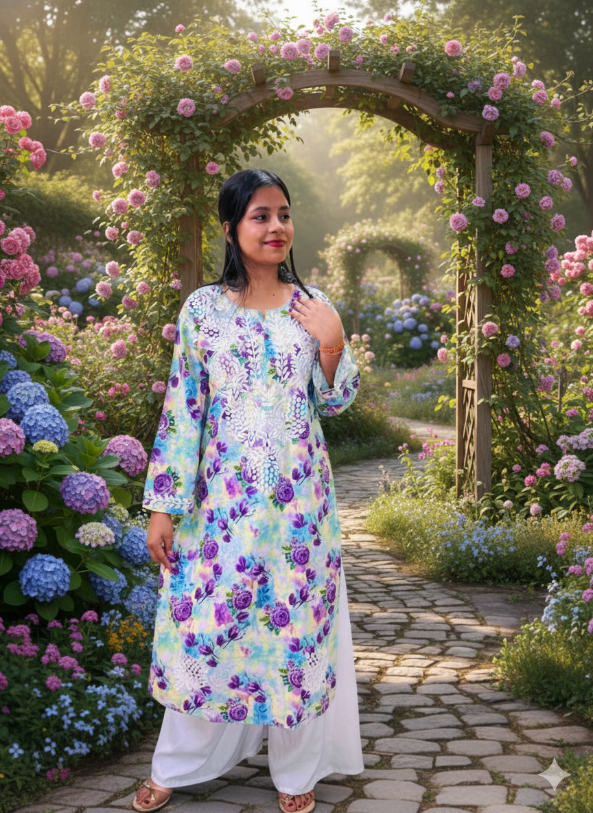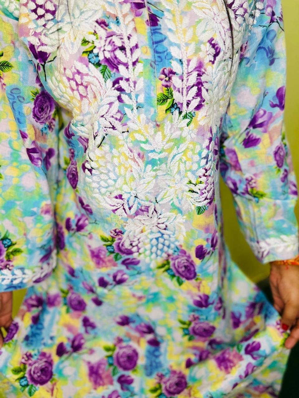 Mul Cotton Long Chikankari Kurta (White Thread) Printed Purple