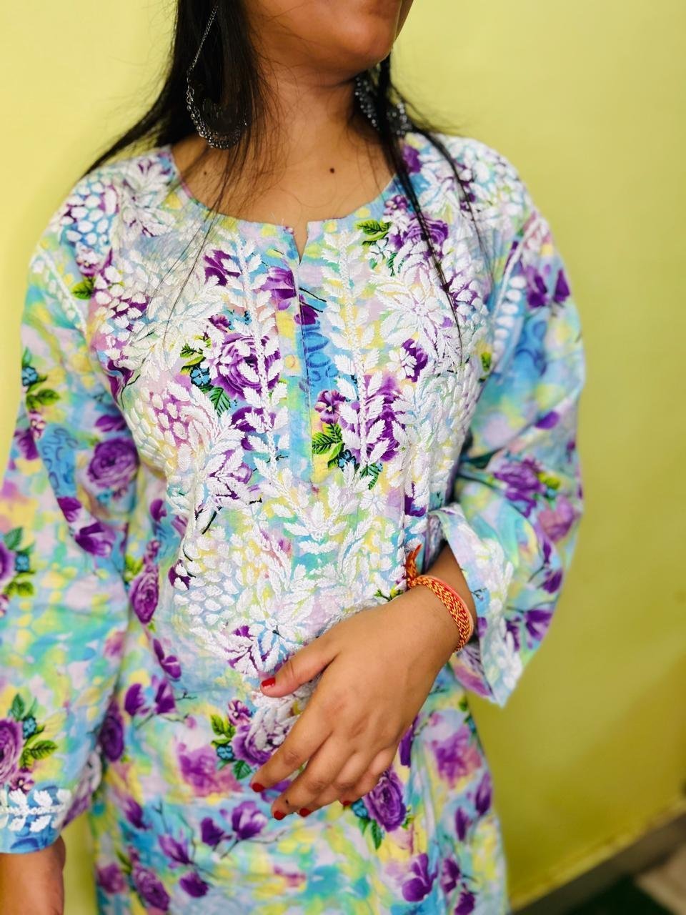 Be the first to review “Mul Cotton Long Chikankari Kurta (White Thread) Printed Blue”